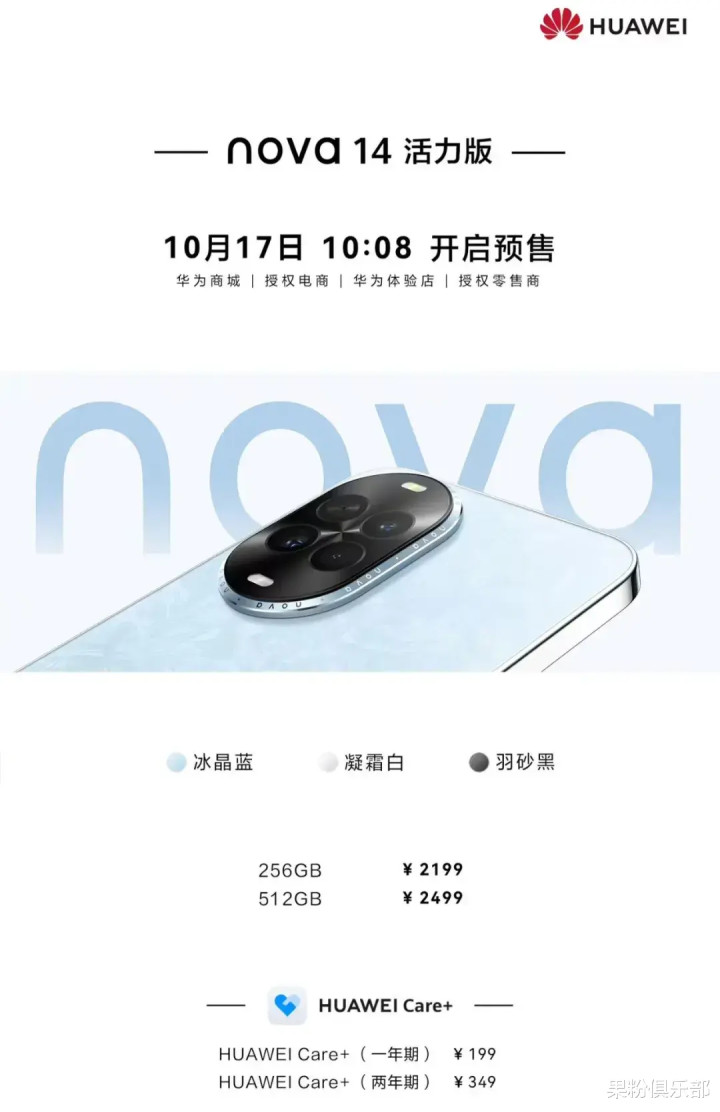 开门见山,nova 14 活力版 256GB 版本售价 2199 元,512GB 版本售价 2499 元。